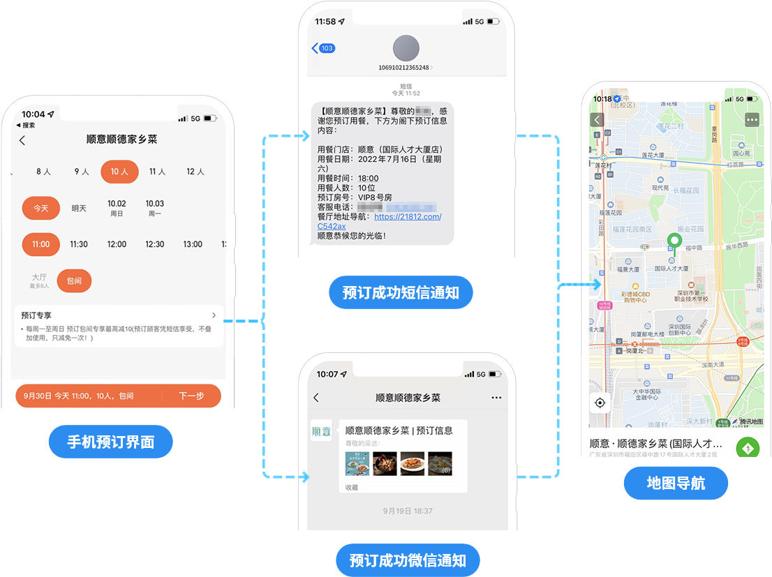 用户可通过电话及小程序订座,预订成功自动通过短信或微信推送预订信息