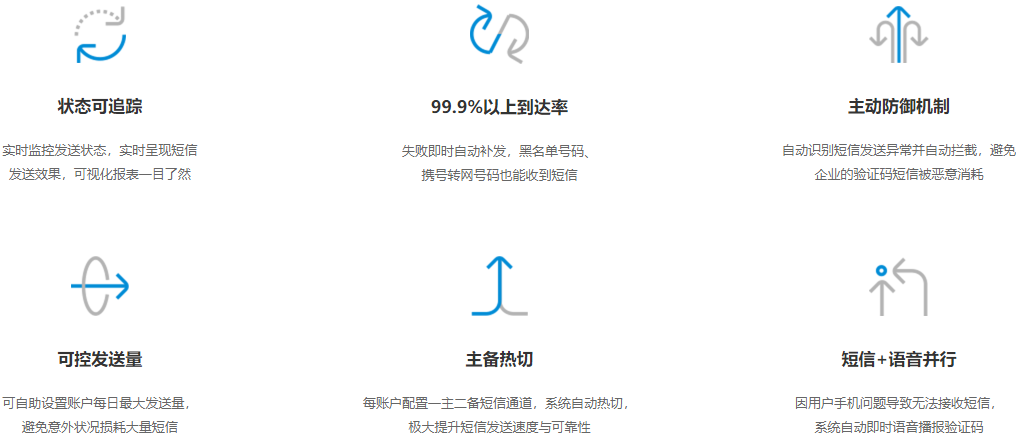 1、失败补发:能实时侦测每条短信的发送状态,如遇异常,短信平台自动换通道补发,解决因用户手机问题、短信通道网络问题、用户号码黑名单问题等导致的短信接收异常;