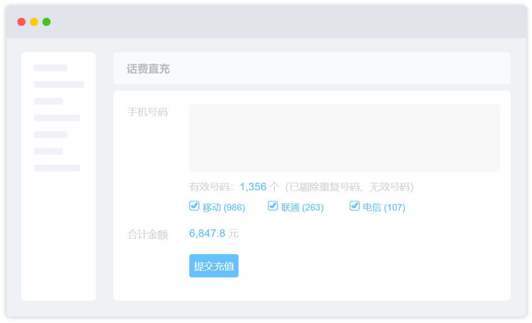 可在线批量导入手机号码直充,系统可自动剔除无效号码、重复号码;直充后可按项目查看图形化报告。