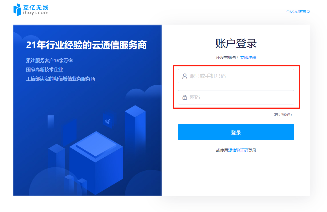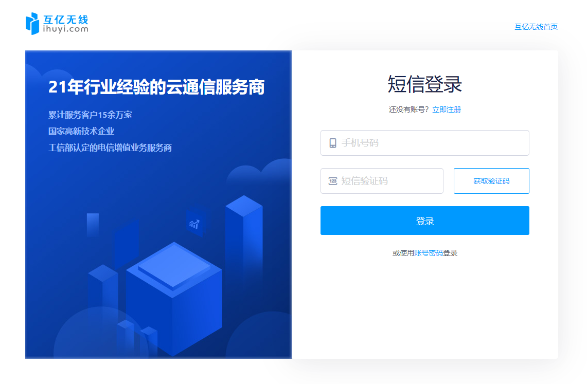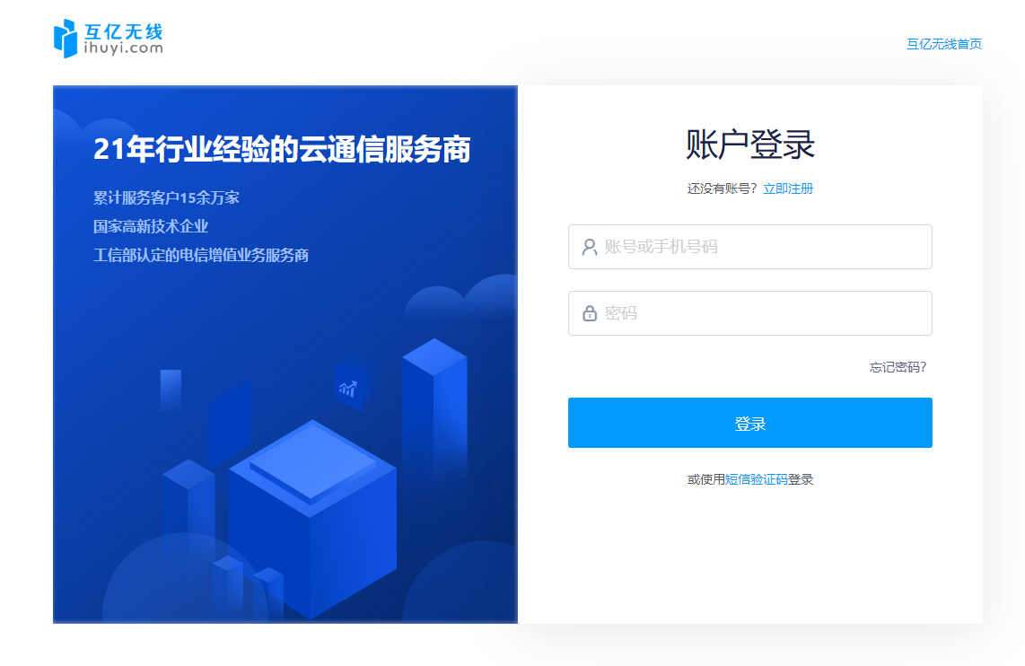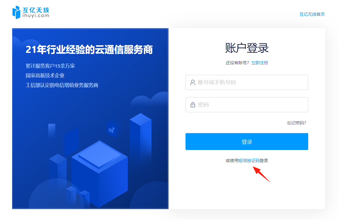 通过互亿无线官网首页的“登录”入口,或直接访问平台登录页面( https://user.ihuyi.com/new/login.html ),进入如下界面: