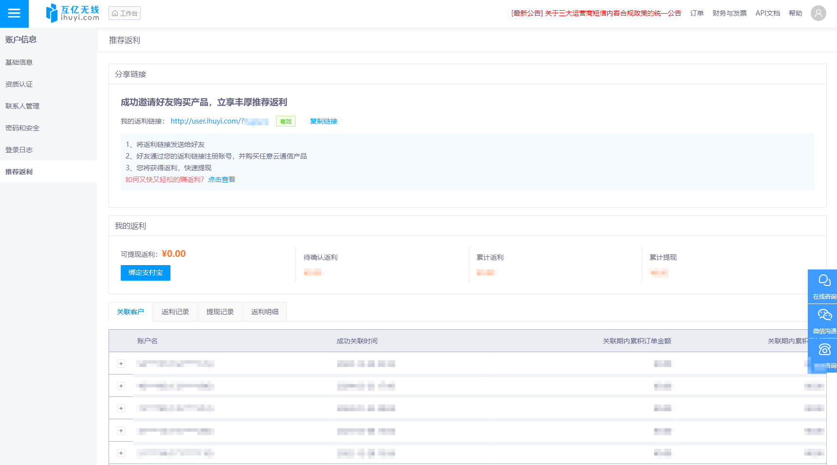 在 账户信息 - 推荐返利 页面,可生成专属返利链接,邀请好友购买产品,成功交易后获取返利;还能查看返利数据(可提现、待确认等 )、关联客户信息,实现推广收益管理 。