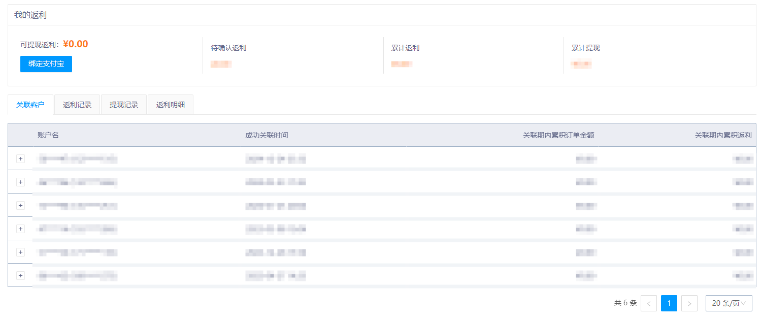- 关联客户和订单:点击“关联客户”“返利记录”“提现记录”“返利明细”,查看关联客户信息(账户名、关联时间、订单金额等 )、返利/提现历史明细,掌握推广效果与收益详情 。