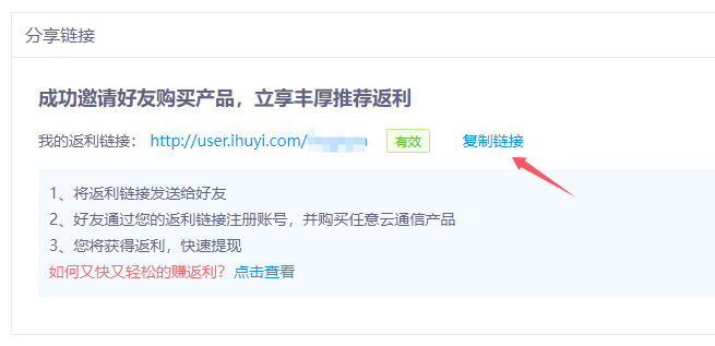 - 找到“分享链接”模块,复制专属返利链接(点击“复制链接” )。