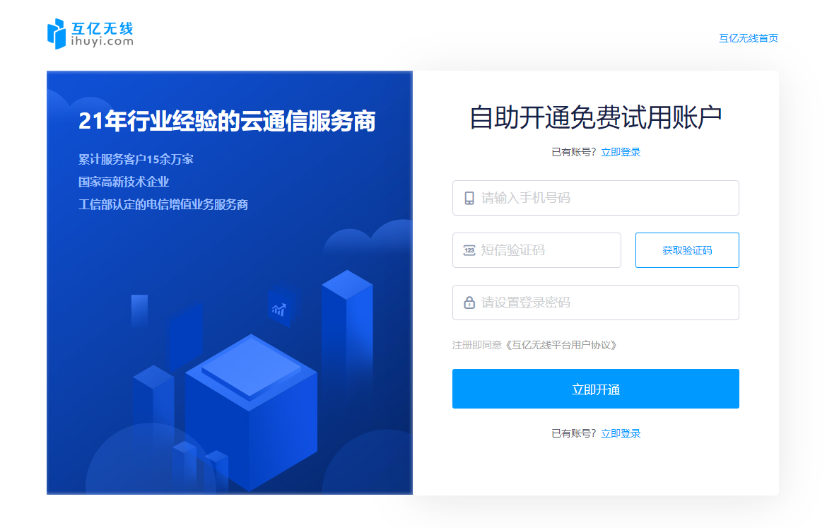 欢迎使用互亿无线云通信平台!以下是账号注册的详细流程,帮助您快速完成账号开通: