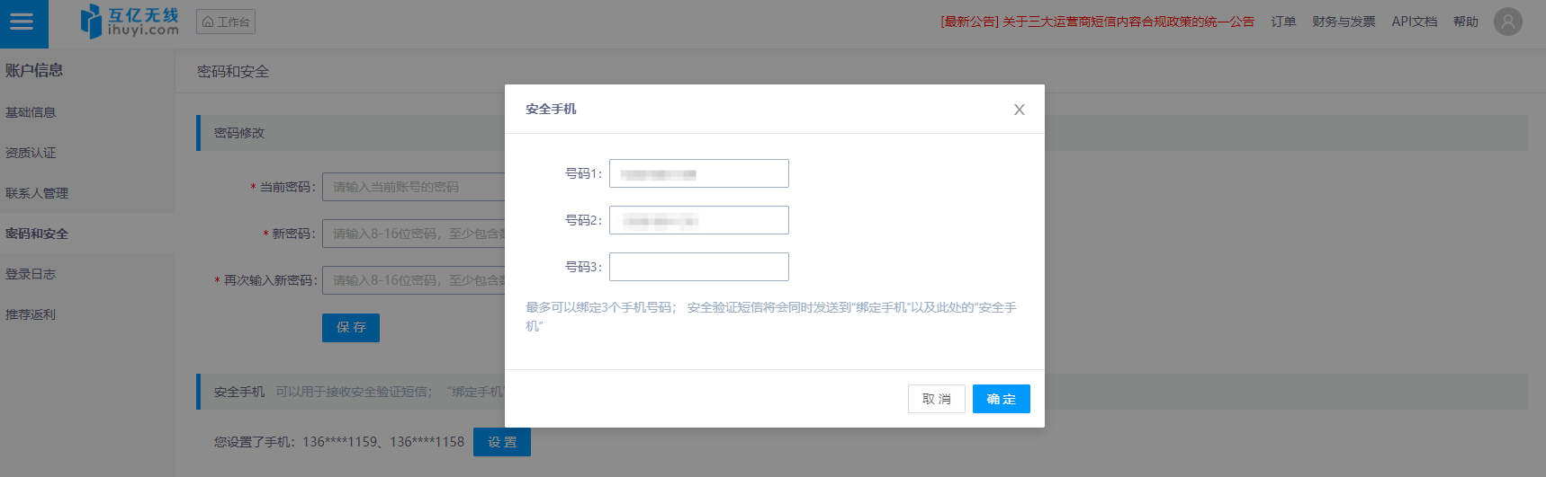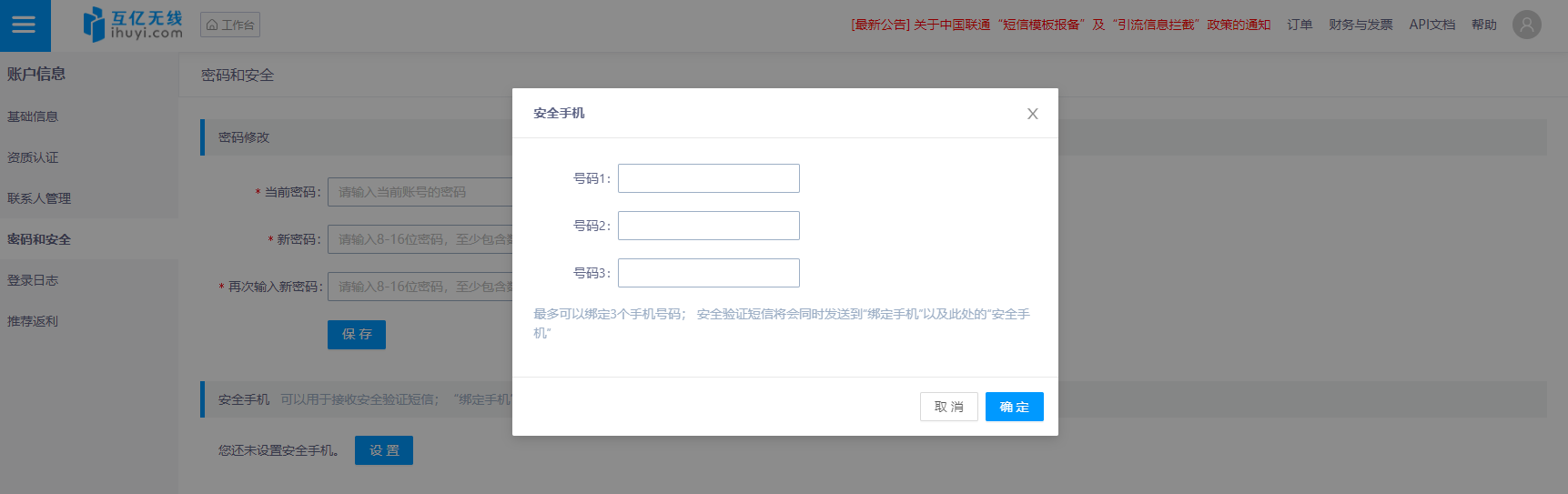 弹出 “安全手机” 弹窗,可填写最多 3 个手机号码(“号码 1”“号码 2”“号码 3” )。填写后点击 “确定”,触发安全验证(同密码修改的手机短信校验流程 ),验证通过则绑定为安全手机,用于接收安全验证短信 。