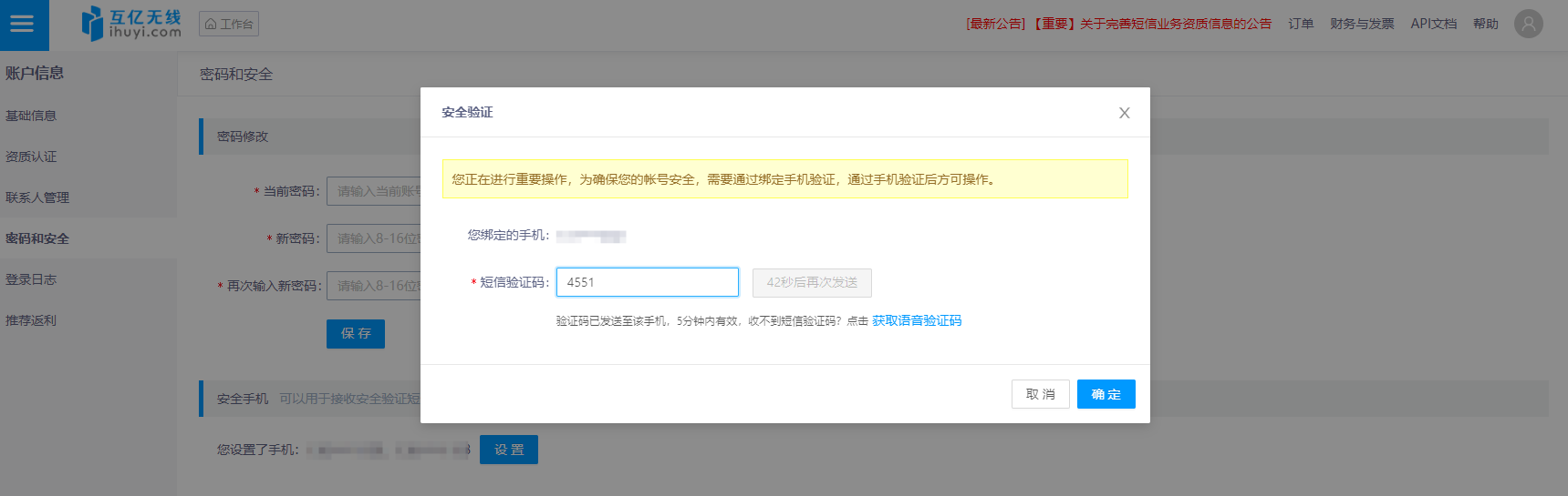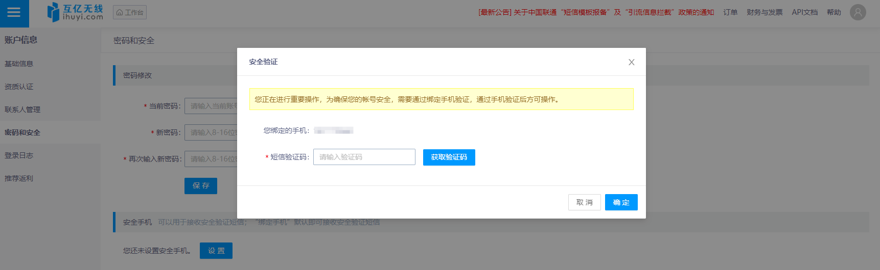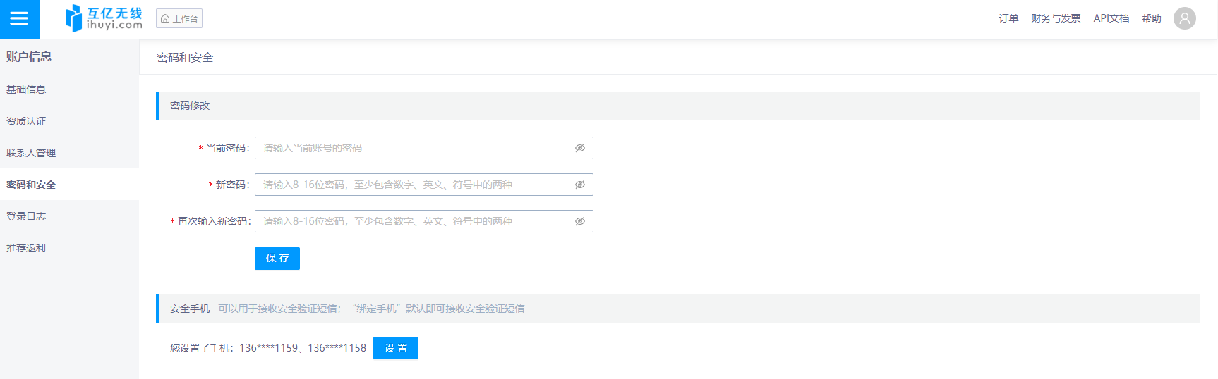 登录互亿无线平台,点击右上角头像,进入 账户设置 - 密码和安全 页面 。