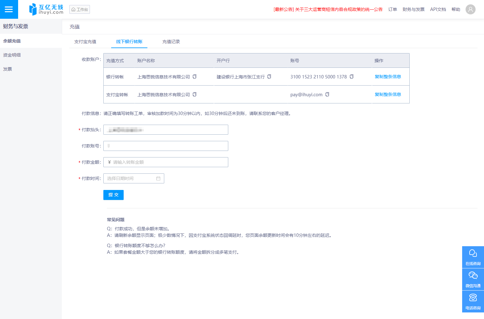 登录互亿无线平台,依次进入 财务与发票 - 充值 - 线下银行转账 页面 ,即可看到收款账户信息、付款信息填写区域及常见问题说明。