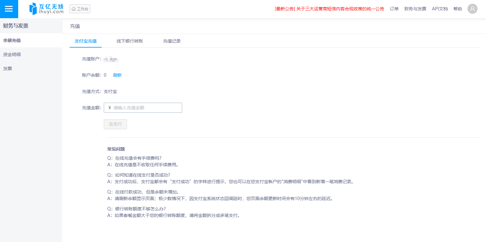登录互亿无线平台,点击顶部导航右上角,进入 财务与发票 - 充值 - 支付宝充值 页面 ,即可看到充值相关界面,包含充值账户、账户余额、充值方式(默认支付宝)、充值金额输入框及“去支付”按钮 。