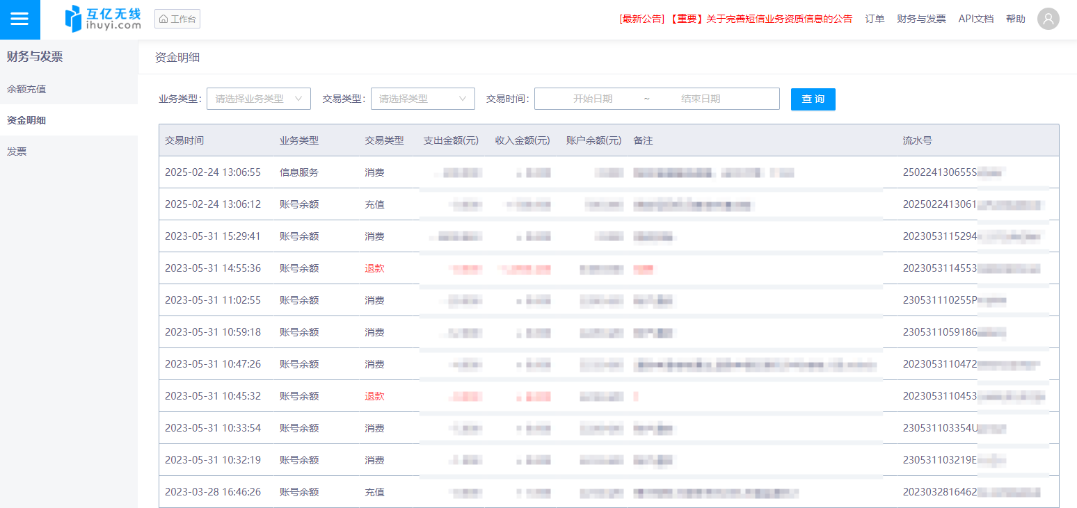 登录互亿无线平台,点击顶部导航右上角,进入 财务与发票 - 资金明细 页面 ,即可看到资金明细查询界面 。