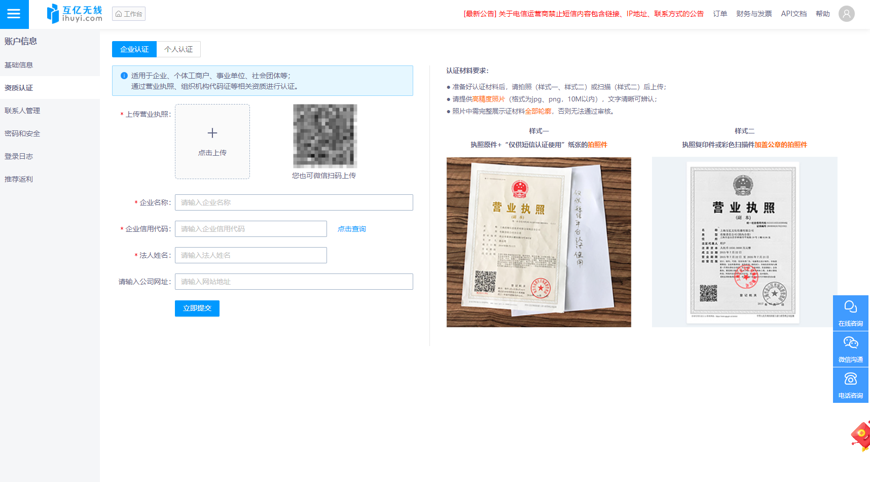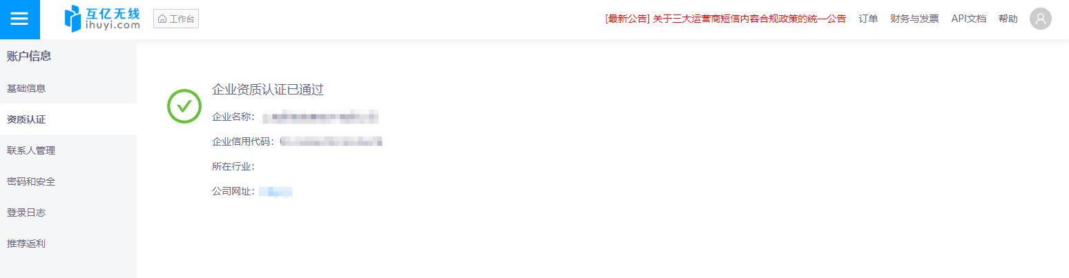 - 认证用途:认证信息仅用于平台服务合规性校验,互亿无线将严格保密,不会用于其他用途(法律法规要求除外)。
