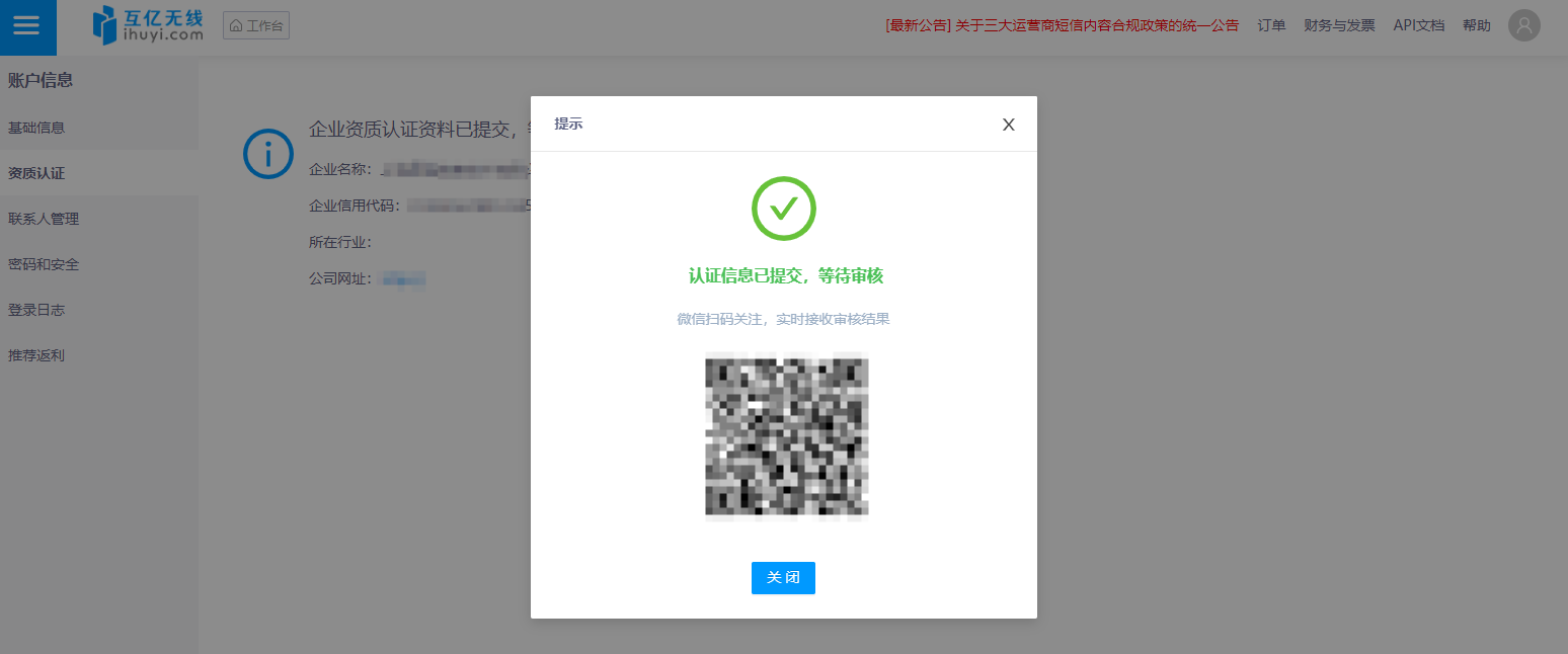提交后,在弹出的窗口可以扫码关注微信公众号,获取审核状态,也可以在“实名认证”中查看审核状态: