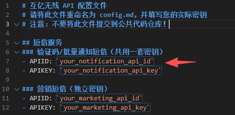 步骤2:打开 config.md,填写互亿无线APIID、APIKEY。如何获取?