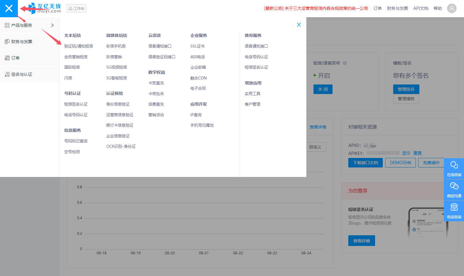 点击左侧导航栏“左上角菜单按钮”(三条横线图标),在展开的“产品与服务”菜单中,选择目标产品(如 “验证码通知短信”),进入产品总览界面。