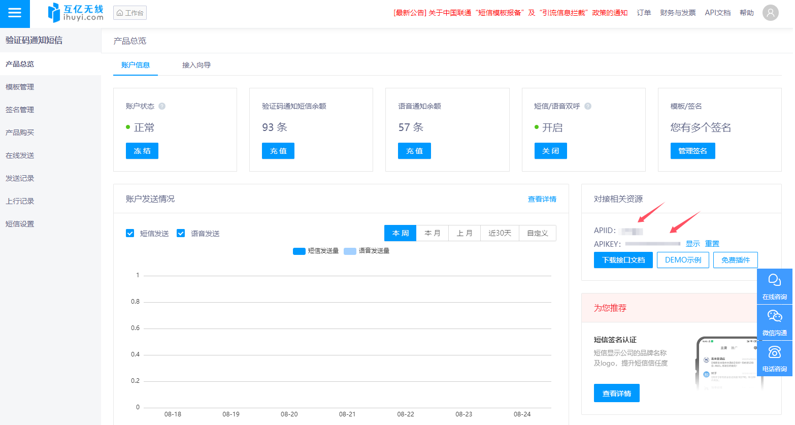 在产品总览的 对接相关资源 模块,查看APIID和APIKEY。APIID可以直接复制,APIKEY需要通过“短信验证码”完成身份核验后,才可以查看完整APIKEY。