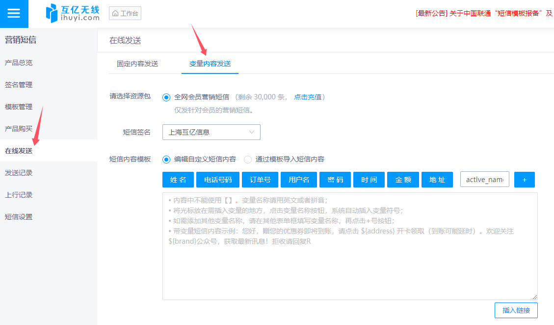 登录互亿无线平台,点击左侧导航栏 “在线发送”,进入发送页面,点击“变量内容发送”。如短信为固定内容,不包含变量,则使用“固定内容发送”,查看固定内容发送流程