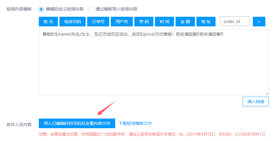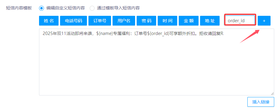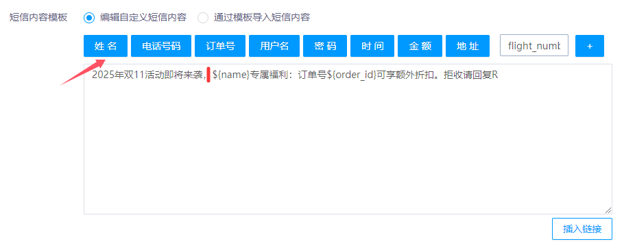 “短信内容模板”选择“编辑自定义短信内容”,然后在“内容框”中手动输入短信内容,并插入预设的变量按钮(如“姓名”、“电话号码”、“订单号”等),快速插入标准变量(格式为 ${变量名} )。