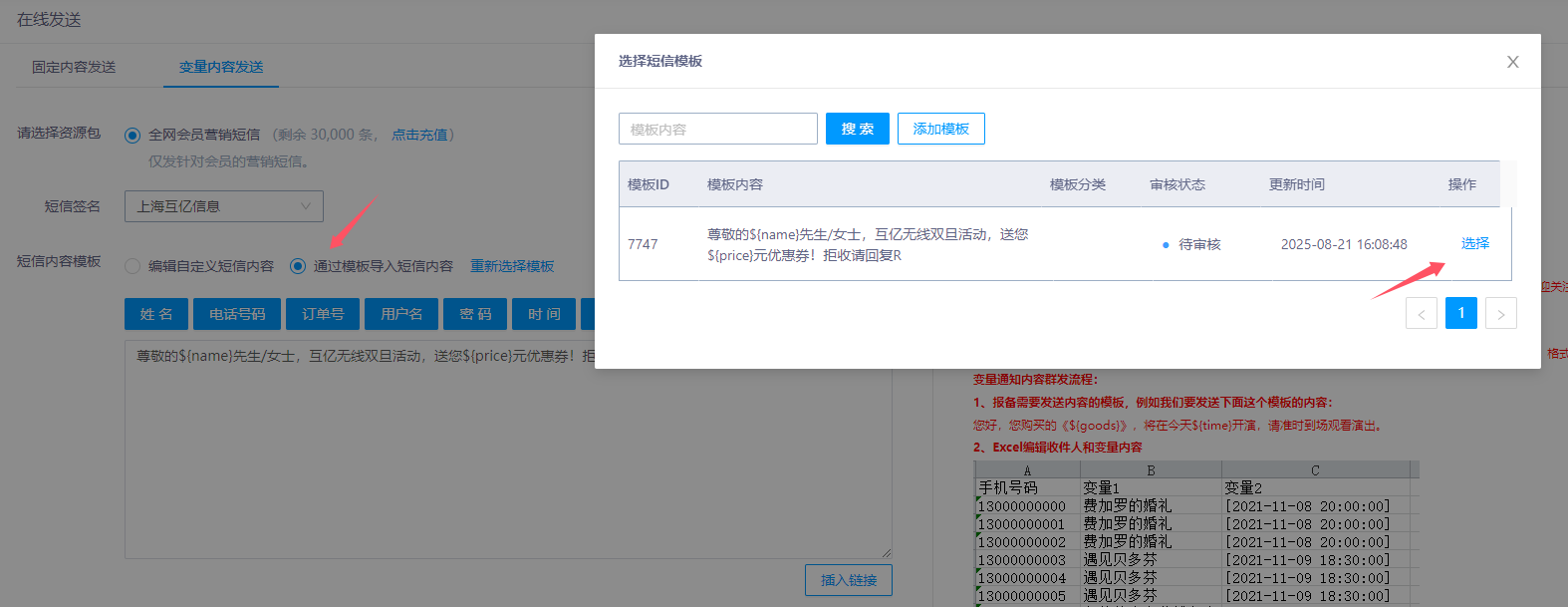“短信内容模板”选择“通过模板导入短信内容”,这种方式可以复用已有变量模板。