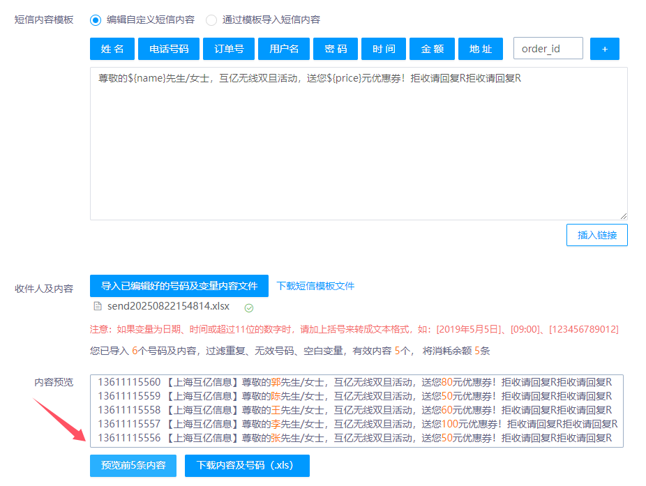 导入成功后,您可以通过点击【预览前5条内容】或者【下载内容与号码】来检查生成后的文字内容。