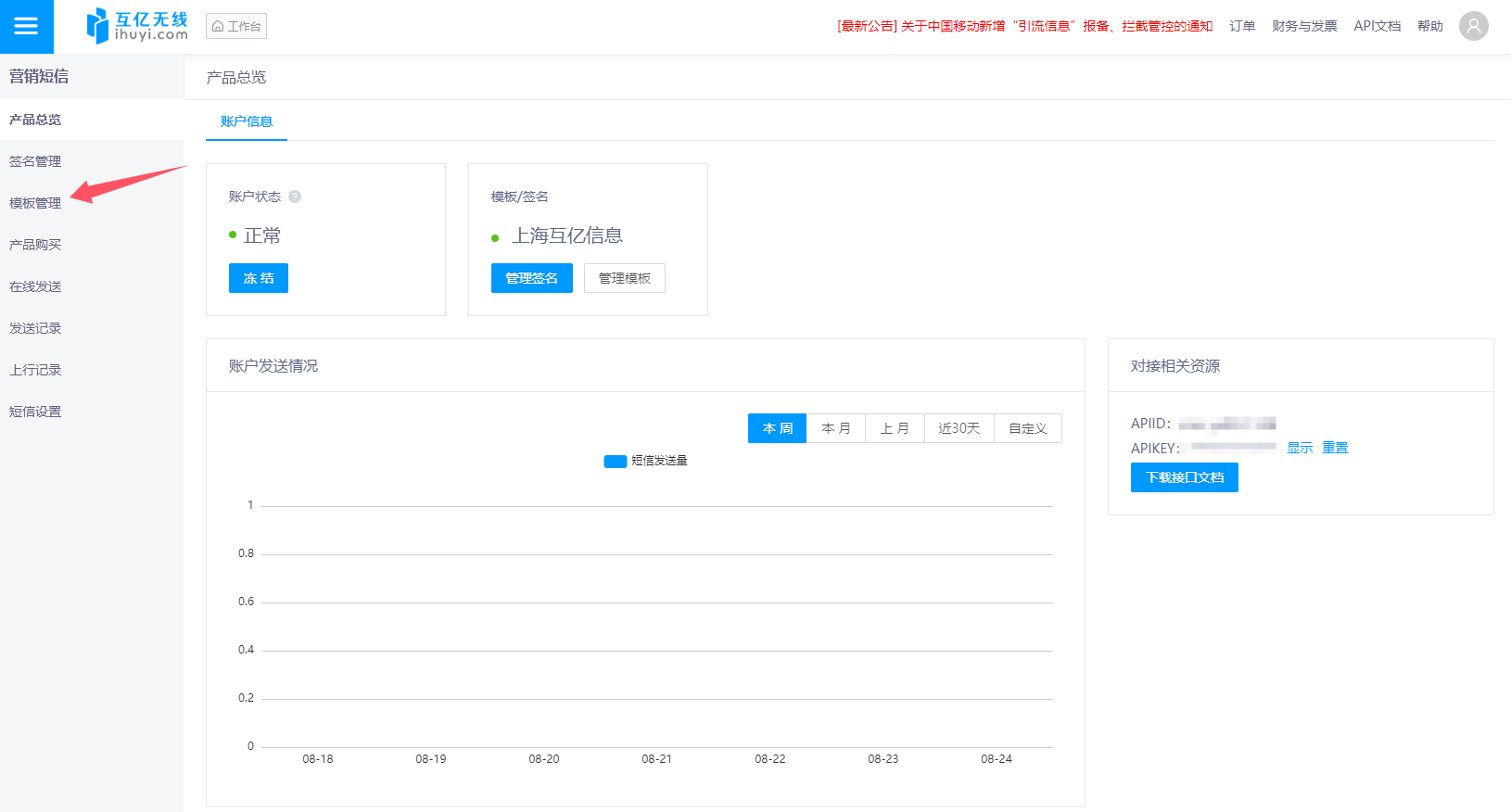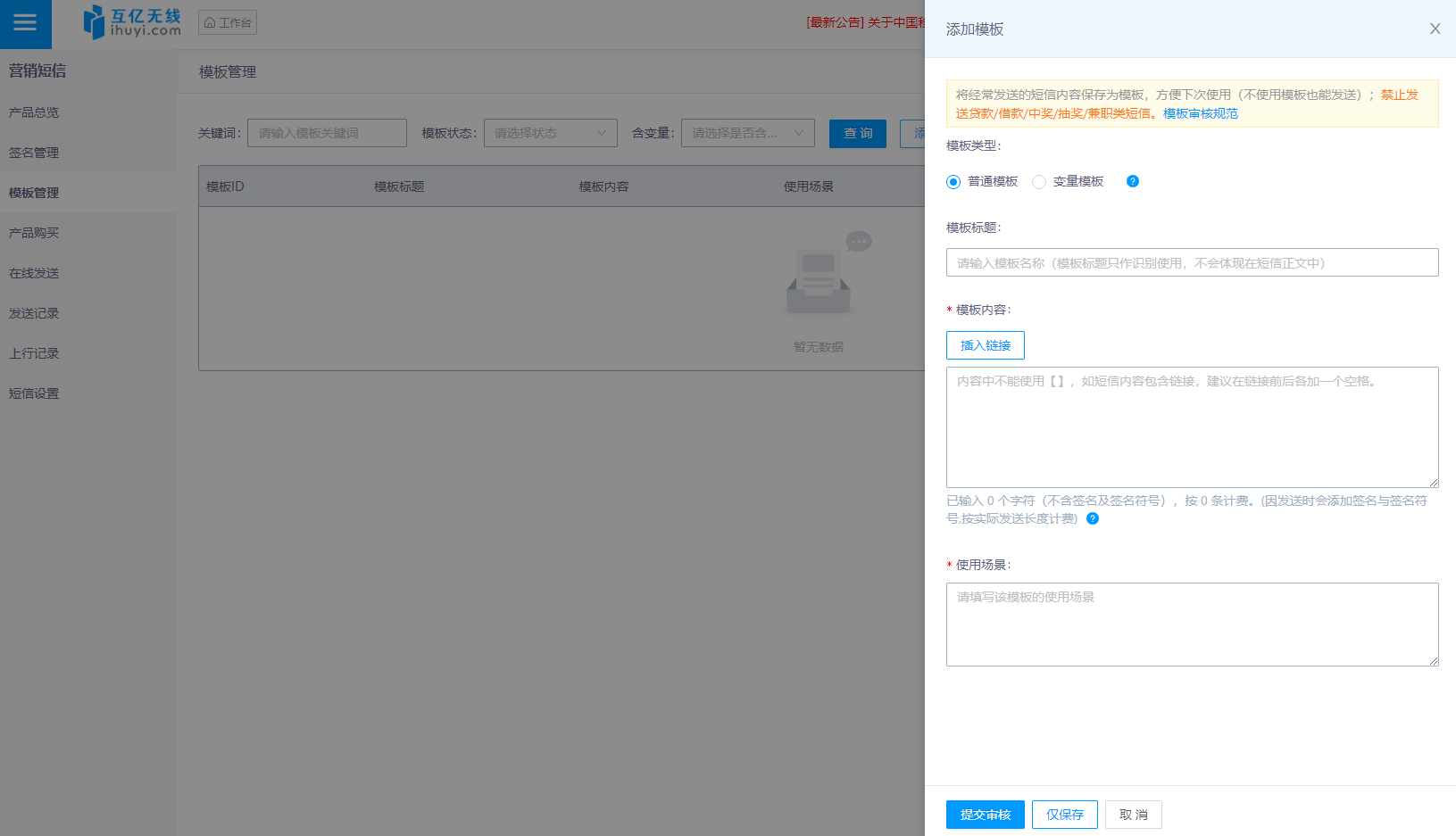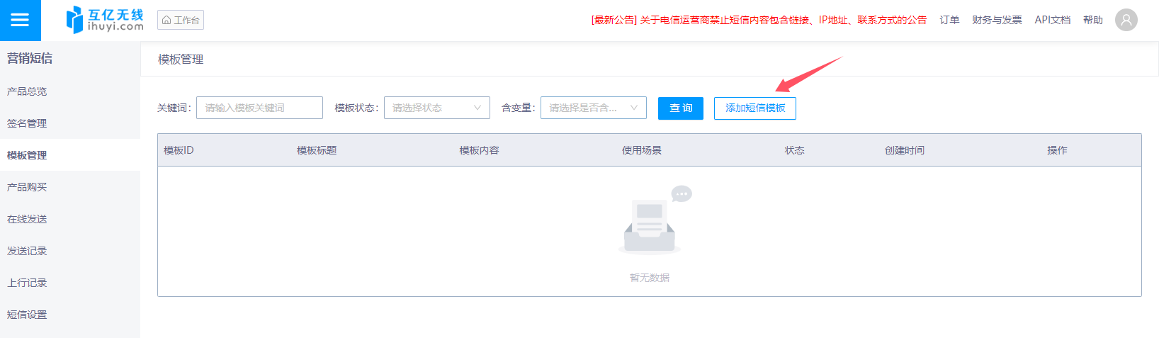 1、进入左侧菜单“模板管理”,进入营销短信模板页面。