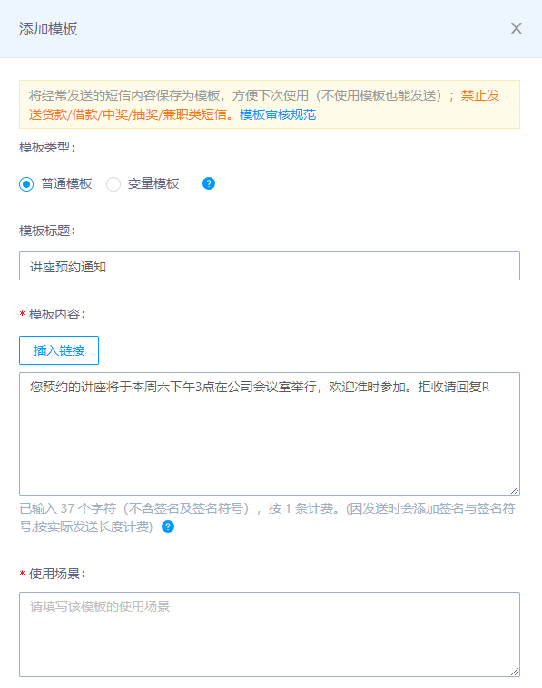 然后输入模板标题(内部查看,不对外展示)。如果是普通模板,则直接输入需要发送的短信内容。