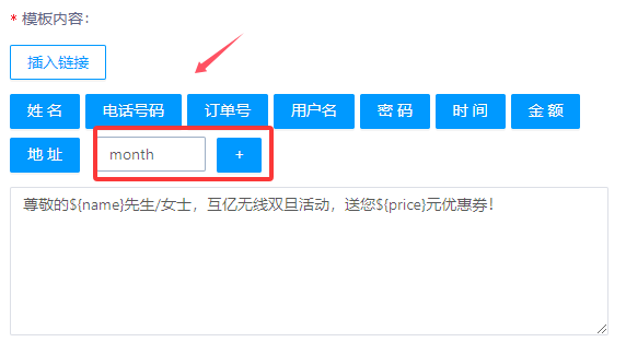 然后输入模板标题(内部查看,不对外展示),然后点击预设的变量名,或者在“输入框”中填写变量的标识名称,然后点击【+】按钮。