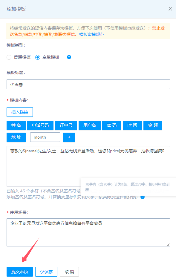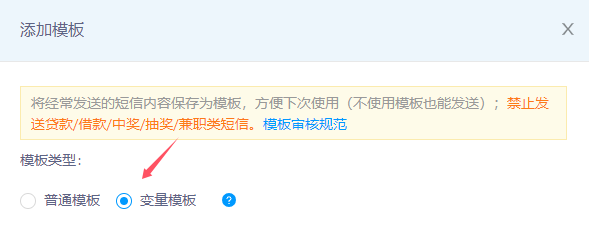 2)如果内容中有包含变量,则需要将“模板类型”设置为“变量模板。”