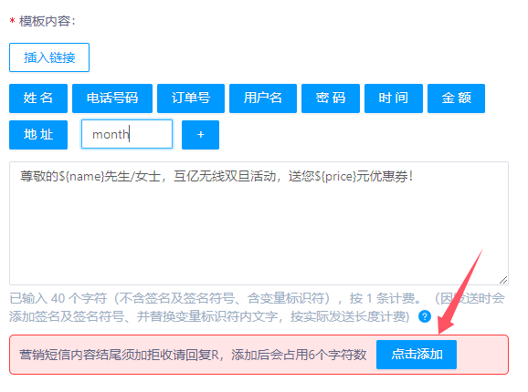 发送营销短信,在短信内容结尾必须带上“拒收请回复R”,如果没有包含可以直接点击【点击添加】按钮。