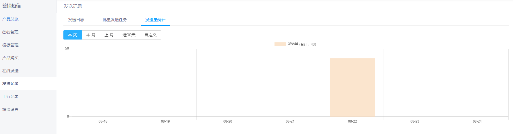 点击“批量发送任务”标签,可以查看时间范围范围内的发送量统计数据,支持按“本周”、“本月”、“上月”、“近30天”、“自定义”等范围筛选。