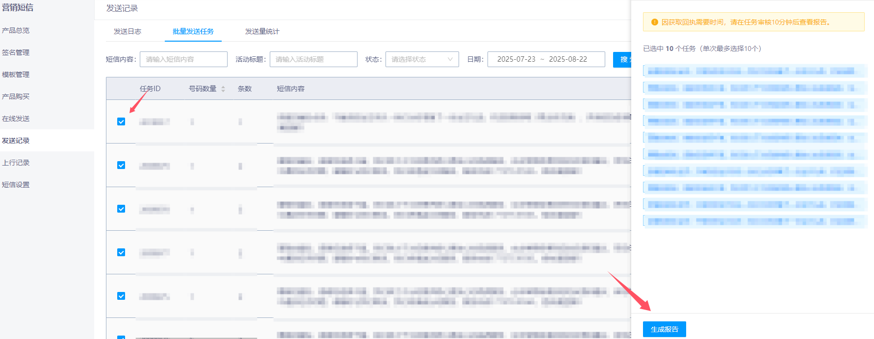 平台支持合并查看多个任务的发送报告,先勾选“任务ID”前的复选框,再右侧窗口中点击【生成报告】按钮。