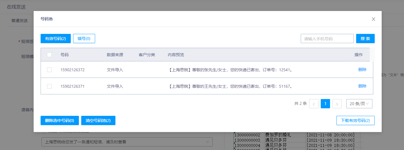 可以核对号码、内容是否于预期结果保持一致。您也可以在本页面执行删除某个号码、清空号码池的操作。