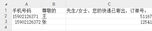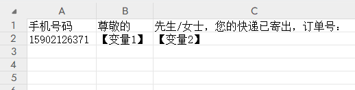 根据模板要求,依次填写收件人的手机号码、【变量1】、【变量2】的文字。