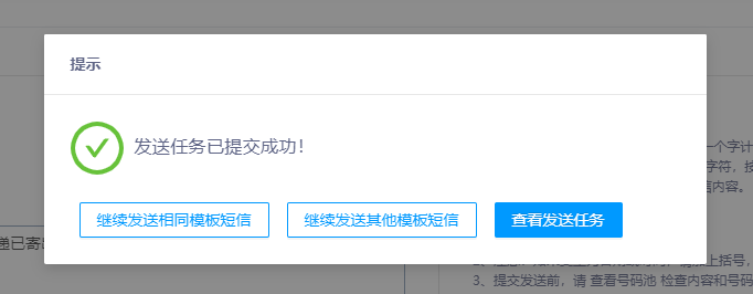 提交成功后,您可以继续发送相同模板短信,继续发送其他模板短信,也可以去查看发送任务。