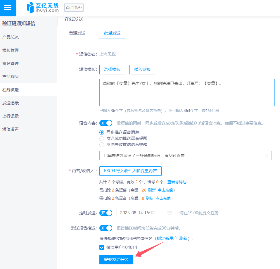 6、短信发送报告支持自动推送。开启后,需要您勾选已绑定的微信。