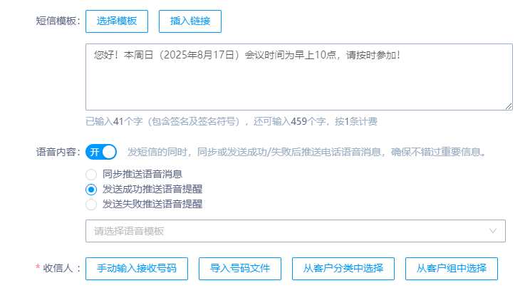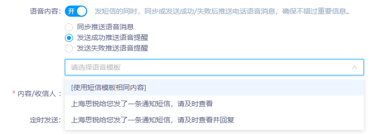 3、平台支持发送短信时发送语音。如需使用此功能,可开启“语音内容”,然后选择通知的类型(同步/成功/失败提醒),并选语音模板。