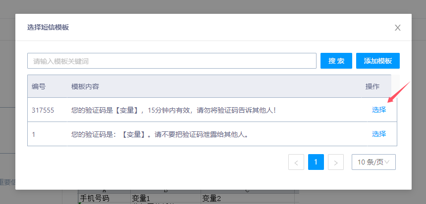 如需使用已报备的短信模板,则点击【选择模板】按钮,在弹窗中选点击该模板“操作栏”中的【选择】。