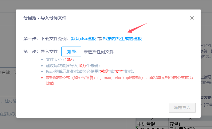 点击【EXCEL导入收件人和变量内容】按钮,在弹出的窗口中,选择导入模板。(建议使用“根据内容生成的模板”,方便您判断信息填写的位置。)