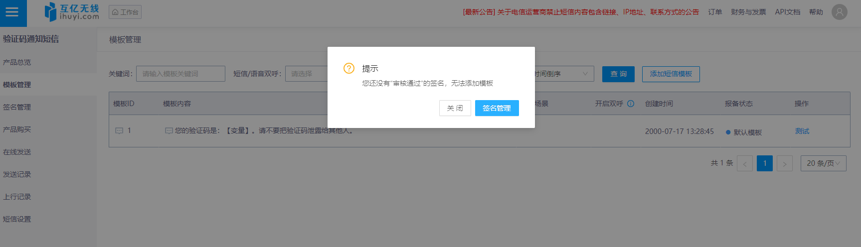 添加短信模板前,需确保有“审核通过”的签名。若未完成,点击“添加短信模板”时会弹出以下提示,此时需先进入 签名管理 完成签名报备。查看签名报备流程