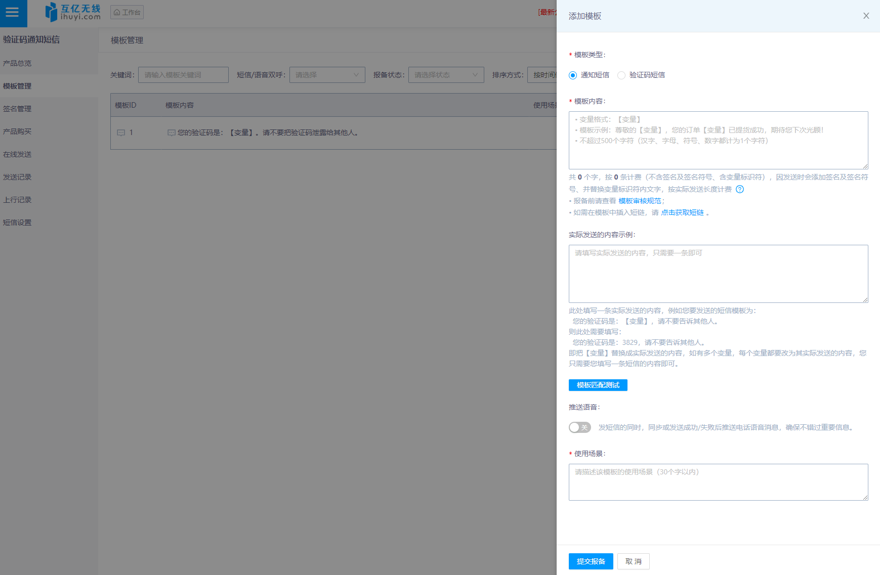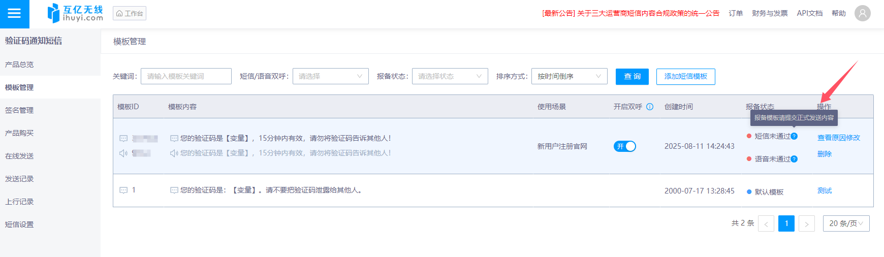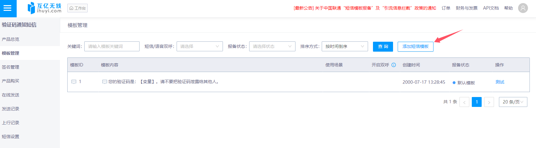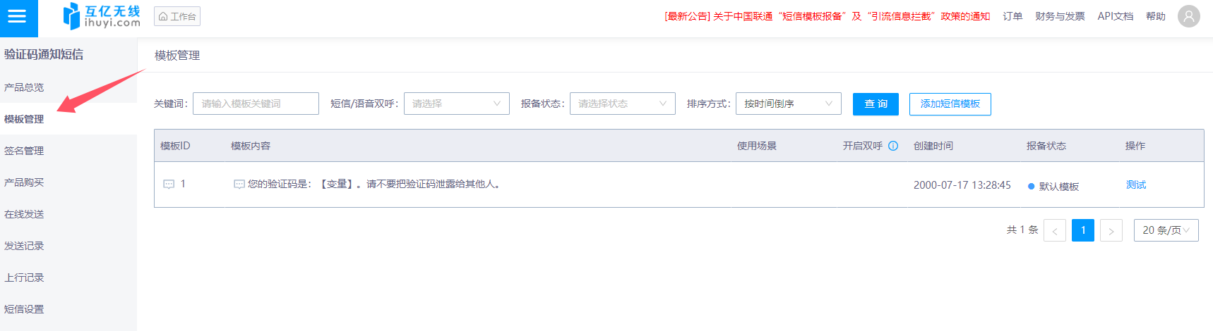 1、进入左侧菜单“模板管理”,进入验证码通知短信模板页面。