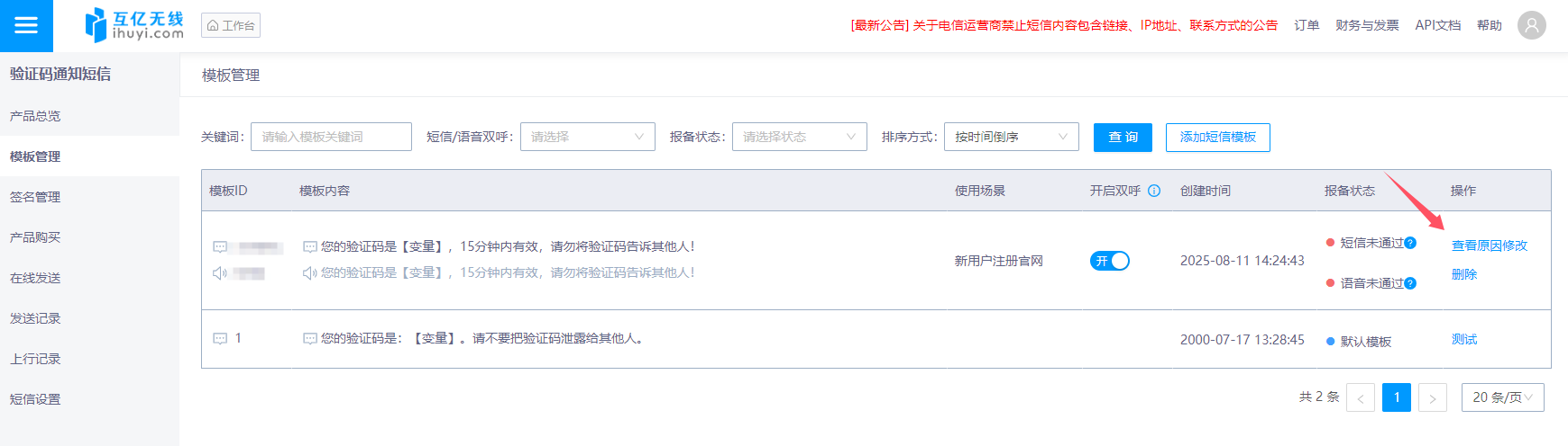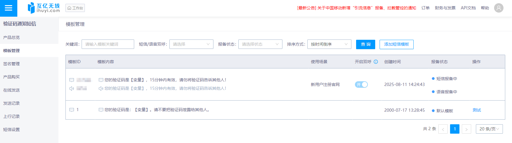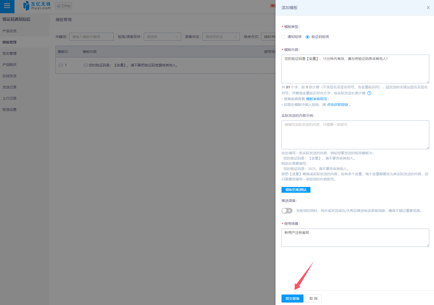 1、进入左侧菜单“模板管理”,进入验证码通知短信模板页面。