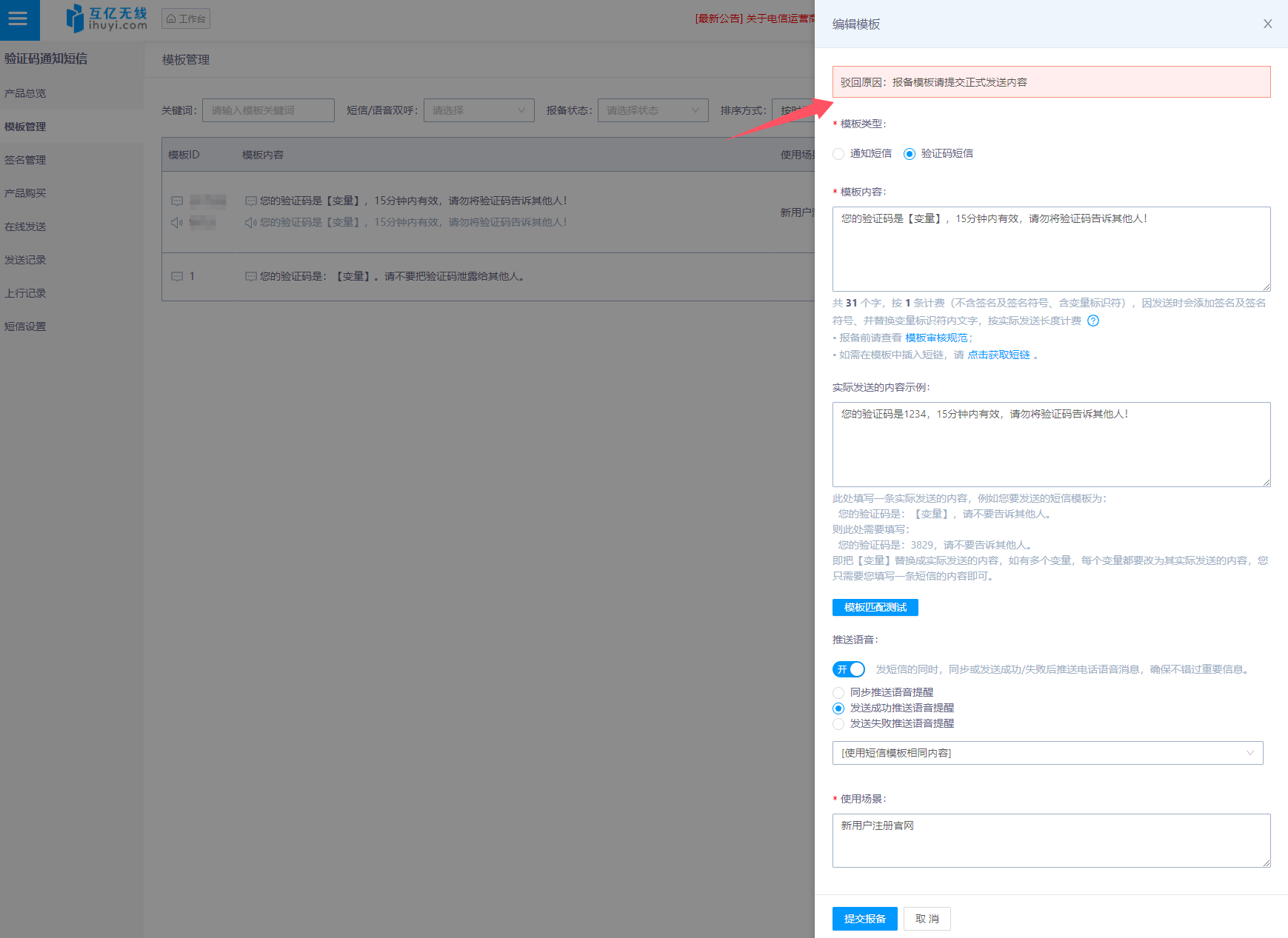 根据提示调整模板内容(如修正内容、补充场景说明等),点击【提交报备】按钮,重新提交审核。