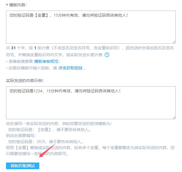 3、填写完内容后,点击【模板匹配测试】按钮,验证模板格式、变量替换是否正常。
