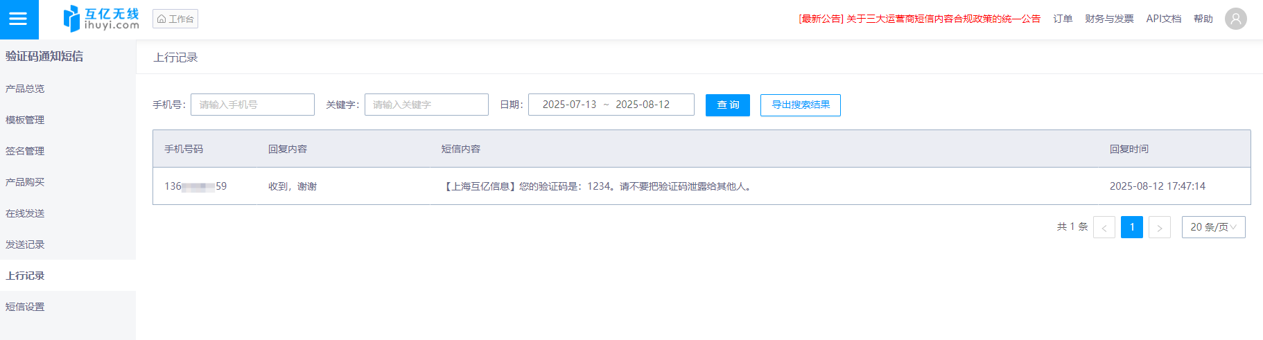 点击左侧菜单“上行记录”,可以查看用户上行回复短信的信息,支持按“手机号”、“关键词”、“日期范围”查询信息。