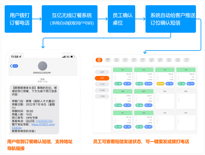 互亿无线提供餐厅预订整体解决方案,管理员在订餐软件上设置订座信息后,系统自动调用预订成功短信通知模板,给用户发送预订短信。
