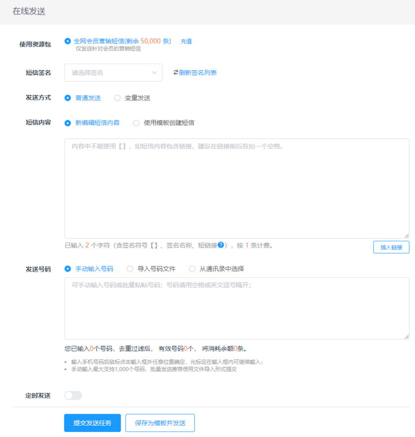 输入或导入手机号码(系统自动过滤无效及重复号码),填写预订短信内容(支持变量)并提交发送(支持定时)。