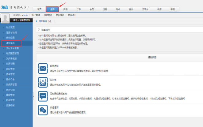 第三步:安装互亿无线短信通知插件,进入系统后台,全局->通知系统->安装互亿无线通知系统