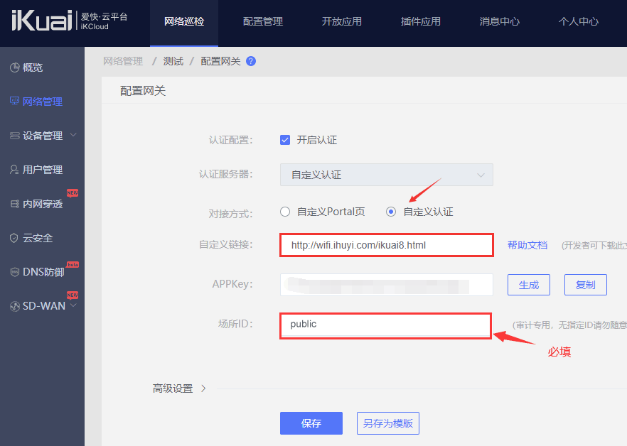 6、对接方式选择“自定义认证”,在自定义链接中填写:http://wifi.ihuyi.com/ikuai8.html,同时在“场景ID”中填写参数(必填,建议值:public)。