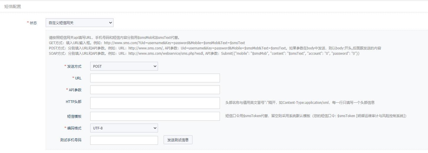 在“系统设置 -> 短信设置”中进行参数配置,配置信息如下: