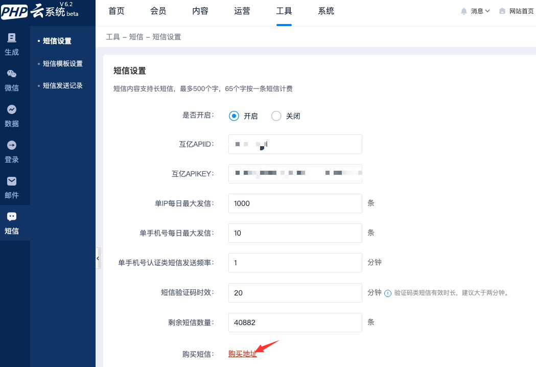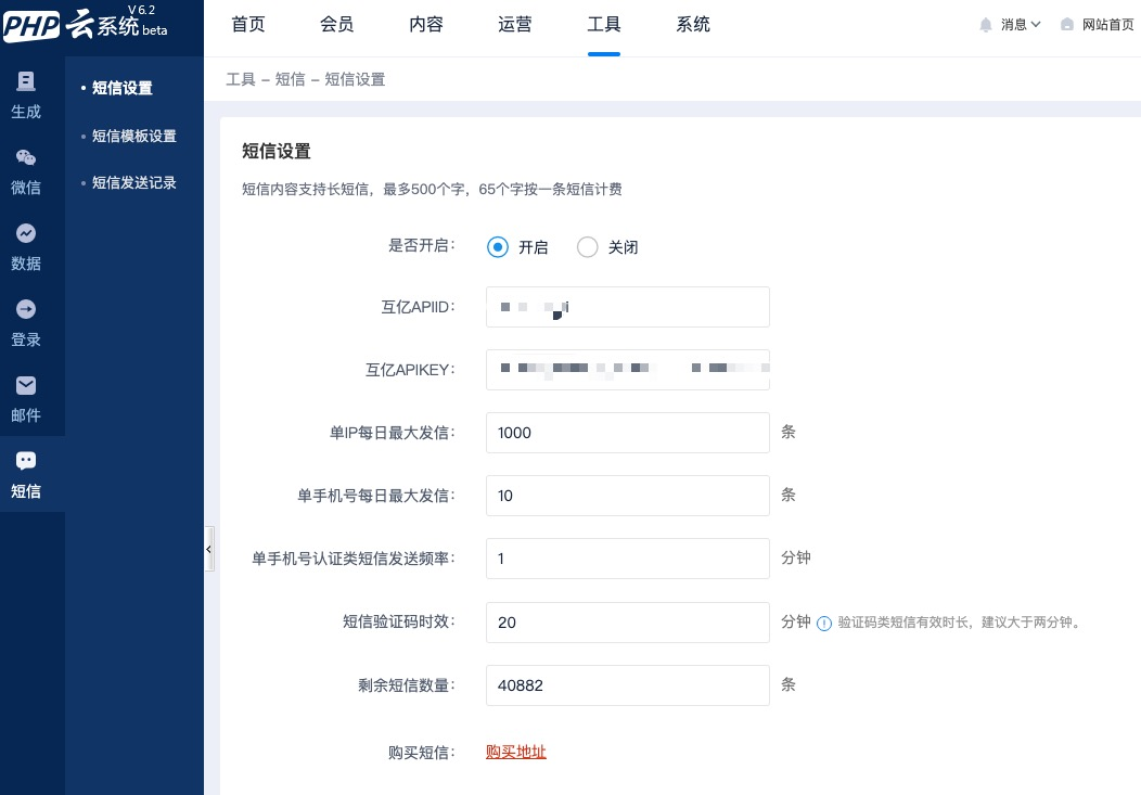 在“短信设置”页面中可查询账号剩余的短信条数,如需购买新的短信套餐,可点击下方的“购买地址”前往互亿无线官方购买短信套餐包。