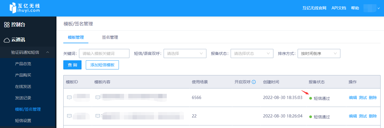 填写完成模板内容后,并注明模板使用的场景,点击“提交报备”按钮,等待平台审核,一般在15分钟内可完成模板审核。审核通过后,在模板管理列表,模板的“报备状态”将更改为“报备通过”。