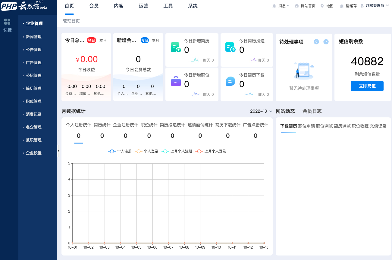 可以在phpyun控制台首页,右侧查看账号剩余的短信条数。可点击下方的【立即充值】按钮,前往互亿无线官网购买短信套餐。